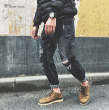 原创潮牌欧美复古街头破洞赤耳水洗修身小脚牛仔裤潮男日系哈伦裤