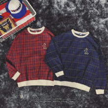 原创秋冬欧美复古原宿港风日系宽松格子撞色套头卫衣情侣外套潮男