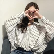 春夏新款韩国chic复古显瘦学院风宽松竖条纹挂脖蝙蝠袖衬衫女上衣