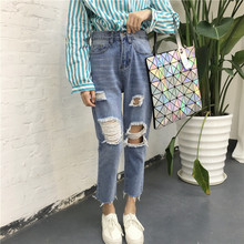 韩版学院风百搭宽松大破洞高腰牛仔裤女哈伦裤九分裤小脚裤长裤潮