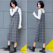 2017春装新款韩范学院风宽松格子长款开叉呢面料背带连衣裙长裙女