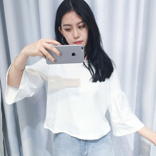 夏装新款韩版学院风简约白色七分喇叭袖t恤女宽松显瘦纯棉上衣潮