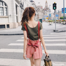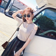 西西小可纯色针织漏肩T恤圆领修身短袖上衣女夏2017新款韩版百搭