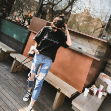 西西小可春季新款宽松bf风垮裤女韩版高腰显瘦破洞流苏九分牛仔裤