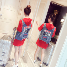 2017夏季新款韩版宽松连帽牛仔马甲两件套休闲中长款连衣裙套装女