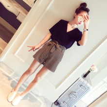 2017夏季新款韩版宽松小香风两件套女时尚高腰雪纺阔腿短裤套装