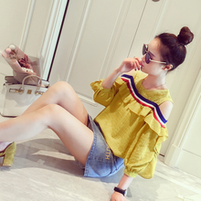 2017夏季新款韩版宽松蕾丝一字领露肩荷叶边上衣女潮灯笼袖雪纺衫