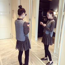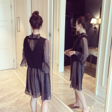 春装新款2017韩版针织马甲背心两件套雪纺花色七分袖连衣裙套装
