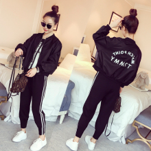 2017春装新款韩版宽松立领休闲短外套两件套黑色运动长裤套装女潮