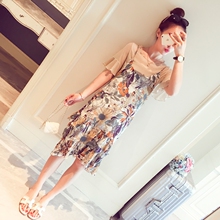 女装春季2017新款潮韩版中长款雪纺碎花连衣裙两件套针织背心套装