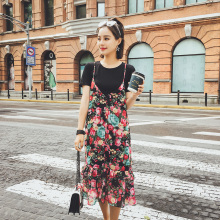 套装裙2017夏装新款复古碎花吊带雪纺连衣裙荷叶边短袖T恤两件套