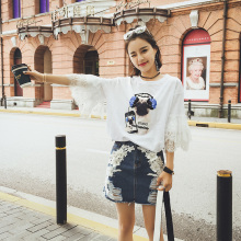 刺绣宽松t恤女夏季新款短袖亮片蕾丝韩版卡通图案喇叭袖上衣体恤