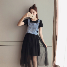 时尚套装女夏季2017新款韩版牛仔背心气质短袖网纱连衣裙子两件套