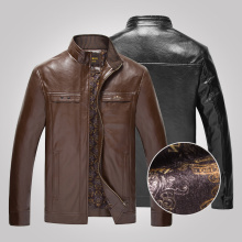 中老年男装2016冬季新款时尚纯色加绒保暖皮衣外套休闲立领皮夹克