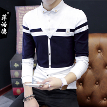 韩版男士秋季长袖衬衫男帅气假两件衬衣青年修身型衣服发型师男装