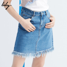 Lily2017夏新款女装商务时尚A型流苏毛边牛仔裙117229G6905
