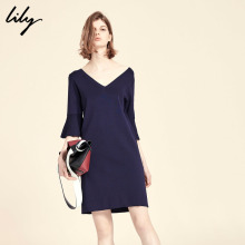 Lily2017夏新款女装V领露背喇叭袖中袖针织连衣裙117220B7702