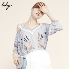Lily2017夏新款女装商务OL性感露肩个性印花雪纺衫117250C8151