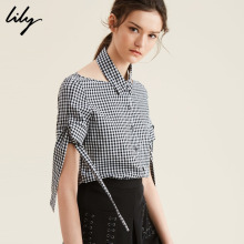 Lily2017新款女装全棉两穿可拆卸翻领格子系带衬衫117219C4917