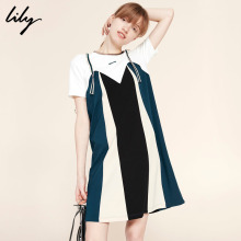 Lily2017夏新款女装商务通勤H型假两件条纹织带连衣裙117240A7543