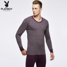 花花公子秋冬薄款保暖内衣青年男士秋衣秋裤套装纯棉全棉条纹圆领