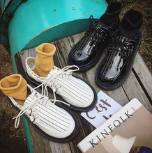 新款原宿zipper港风简约条纹朋克少女帅气街拍绑带漆皮厚底小皮鞋