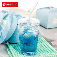 天喜玻璃杯创意吸管杯儿童卡通杯子带盖冷饮杯果汁奶昔杯成人水杯