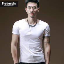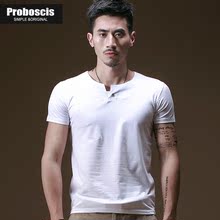 【88元3件】夏季毛边大V领短袖t恤男性感半袖修身潮纯色韩版上衣