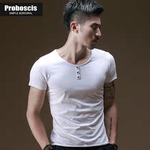 【88元3件】短袖t恤夏季男纯色v领单钮扣修身韩版半袖潮上衣服装