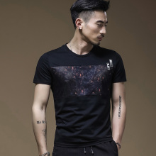 普罗波仕夏季男士短袖t恤拼接玫瑰花网印花黑色圆领修身上装衣服