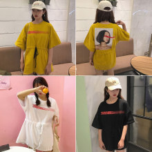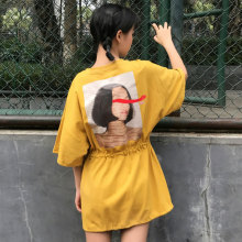 春夏韩版后背人物印花中长款短袖T恤裙子宽松收腰抽绳套头上衣女
