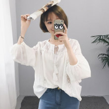2017春装新款休闲简约百搭棉麻打底衫韩范宽松镂空长袖上衣女学生