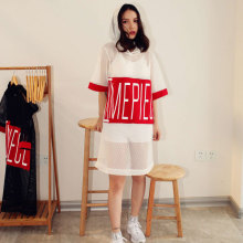 夏季新款字母印花贴布网眼拼接中长款宽松透视连帽短袖T恤女罩衫