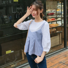 春夏韩版拼接条纹吊带假两件宽松衬衫七分袖短款学生套头娃娃衫女