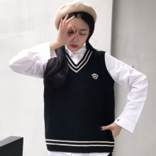 2017春季女装韩版学院风减龄徽章V领无袖针织衫背心马甲套头毛衣