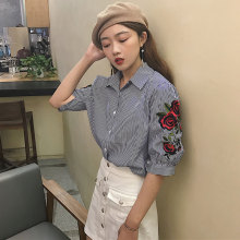 2017夏季韩版条纹五分袖衬衣宽松显瘦玫瑰花刺绣打底衫中袖衬衫女