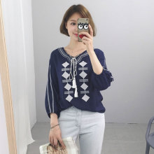 2017春装韩版民族风几何刺绣系带流苏娃娃衫泡泡袖宽松套头衬衫女