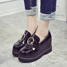 圆扣流苏松糕鞋女2017春季新款浅口漆皮休闲厚底坡跟套脚高跟单鞋