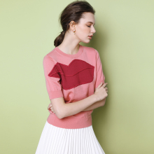 奥芝国 羊毛混纺 粉色红唇手工刺绣短款短袖修身 毛衣薄针织衫 女