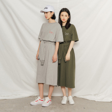 LOVEHEYNEW夏季中长款纯色刺绣绑带假两件短袖T恤连衣裙女