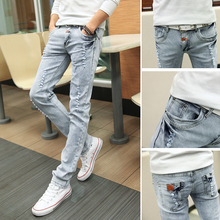 夏季弹力牛仔裤男士韩版修身小脚裤潮男装休闲薄款破洞铅笔男裤子