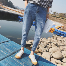 夏季潮流破洞牛仔裤男士九分裤男装韩版修身哈伦裤青少年百搭裤子