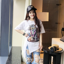2017韩版女装春夏装新款圆领串珠破洞不规则卡通印花短袖T恤潮Y52