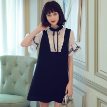 2017夏高端女装新款A字裙系带拼接蕾丝喇叭袖复古名媛气质连衣裙