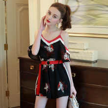 MIUCO女装2017夏季不定位印花荷叶边条纹漏肩吊带连体裤阔腿短裤