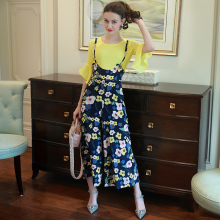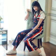 MIUCO2017新款夏装白上衣+侧条纹印花吊带连体裤阔腿裤套装女高腰