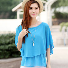 2016夏装韩版新款上衣大码女装宽松显瘦蝙蝠袖假两件雪纺衫女短袖