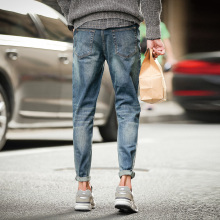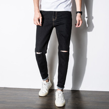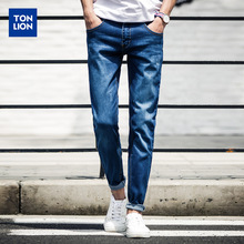唐狮男装牛仔裤男青年修身型小脚弹力裤薄款男原色破洞九分牛仔裤