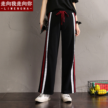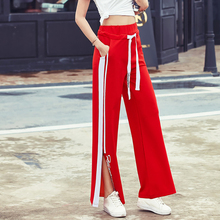 2017夏季新款韩版红色宽松运动休闲裤子高腰条纹开叉长阔腿裤女潮
