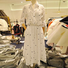 2017夏款新品印花文艺长袖连衣裙收腰显瘦中长款OL大摆衬衫裙子女